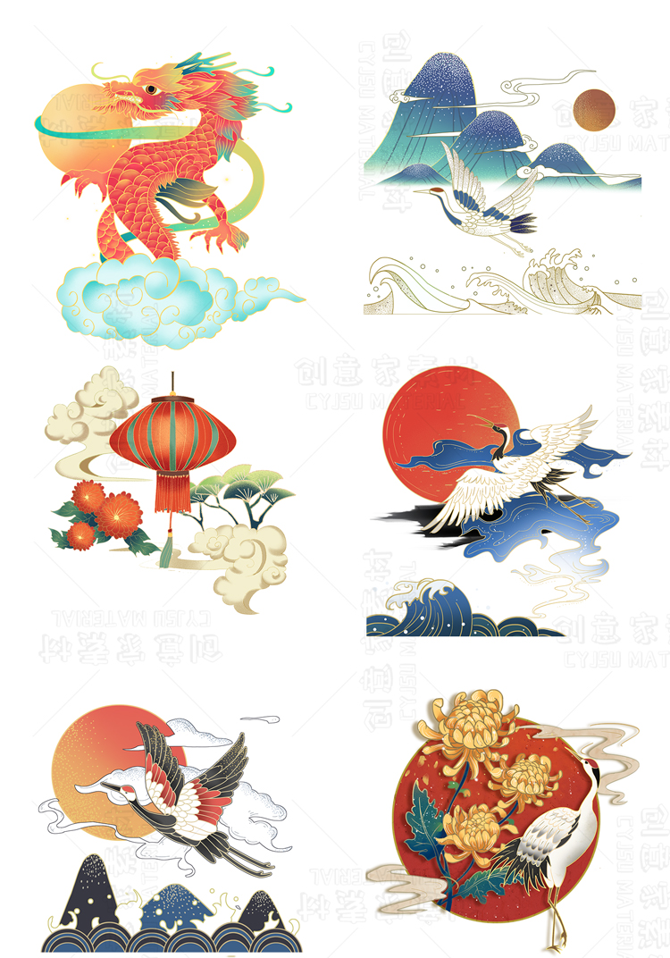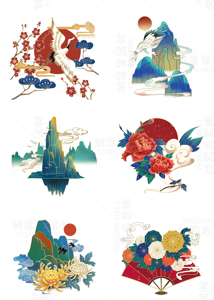 › 国潮海报设计手绘古典山水仙鹤元素PNG高清图片平面设计免扣素材